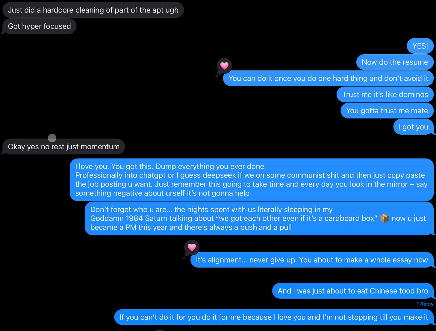 We are, both of us, spectacularly messy resilience machines. Don’t romanticize the chaos—remember when you became a PM this year? Let that sink in. You had a setback; I’ve been fired, and I have sat on the floor with a bottle and a guitar singing the worst songs to myself for days. I watched the victim narrative like a ritual. I blamed the economy, tech, the HR department, the Finance Department, my ex for breathing air. Then I stopped. The gap between failure and bounce-back—that’s the crucible. That’s where we find out what we’re made of. I will not stand by while you talk yourself into oblivion. I’m scared when you start expecting the other shoe to drop.