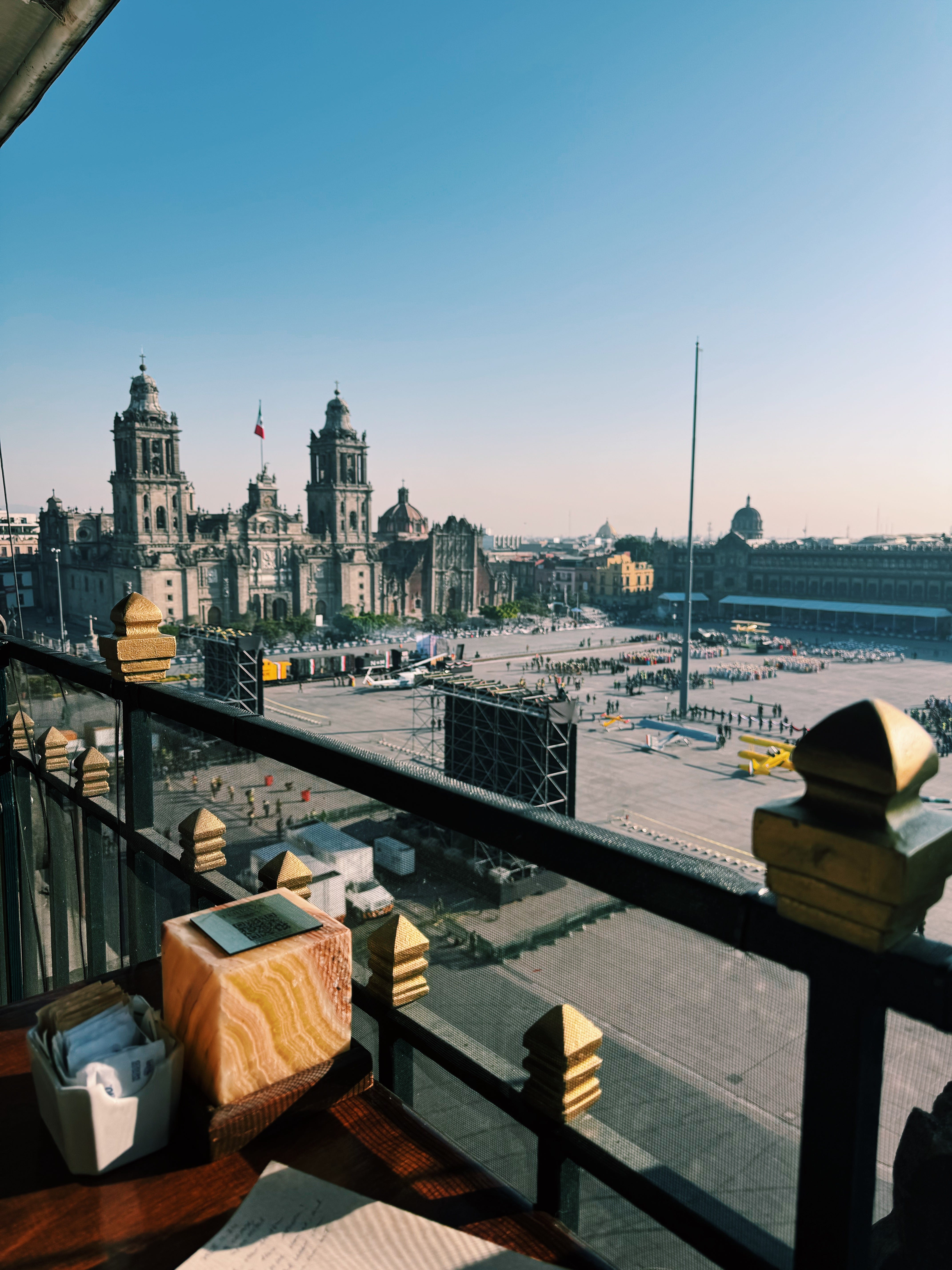 Each morning, I did my usual writing, but with a different view and different food to taste. On one of these mornings—Revolution Day, to be specific—I accidentally ended up in the Gran Hotel Ciudad de México. The streets were blocked off by the police, and in Spanglish, I’d meant to ask if I could get a reservation at the hotel’s rooftop restaurant for breakfast. Apparently, I very confidently said that I did have a reservation, and ended up with this presidential view: